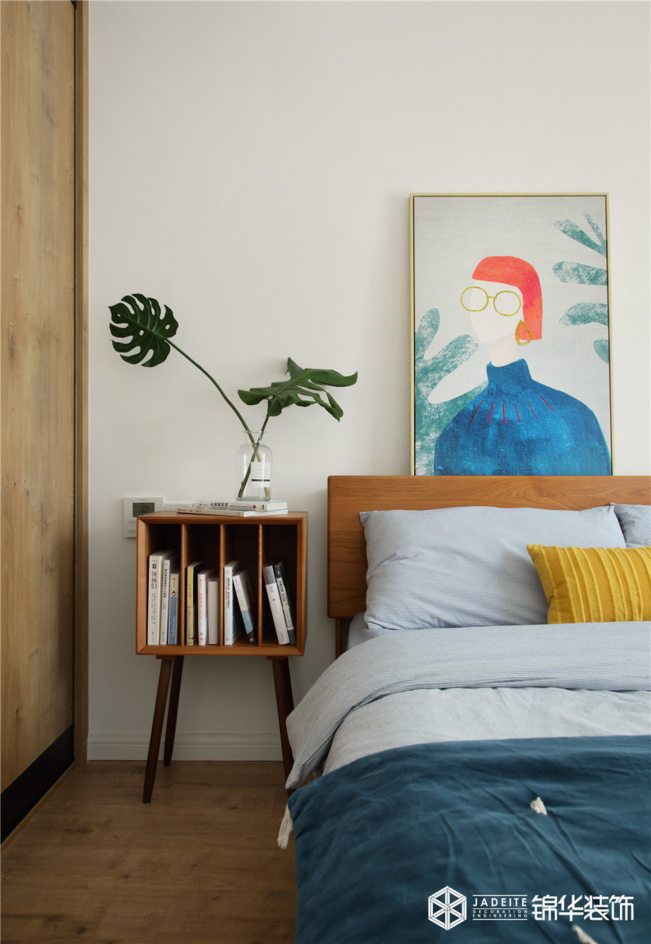 ▲臥室頂面和墻壁刻意保持干凈,藝術(shù)感的裝飾畫和恣意舒展的龜背竹給予空間一種簡潔、童趣和復(fù)古的調(diào)性!