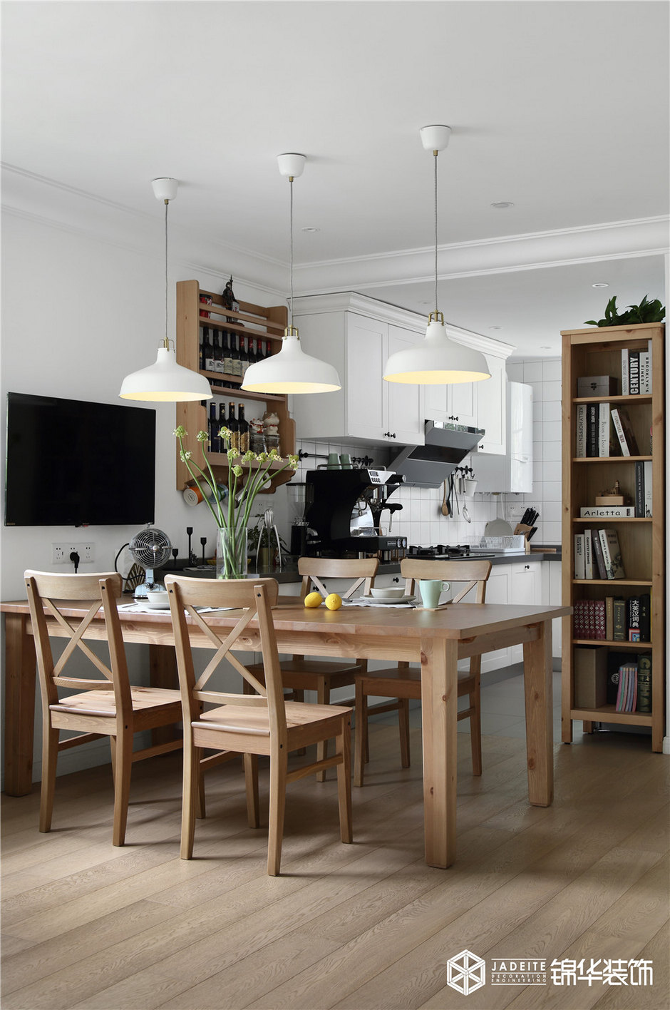 客廳以清新的白色護(hù)墻板搭配溫馨的米色墻紙,豐富了整個(gè)空間層次。電視背景墻處做了一扇隱形門,使得整個(gè)空間更加具有完整性和對(duì)稱性。