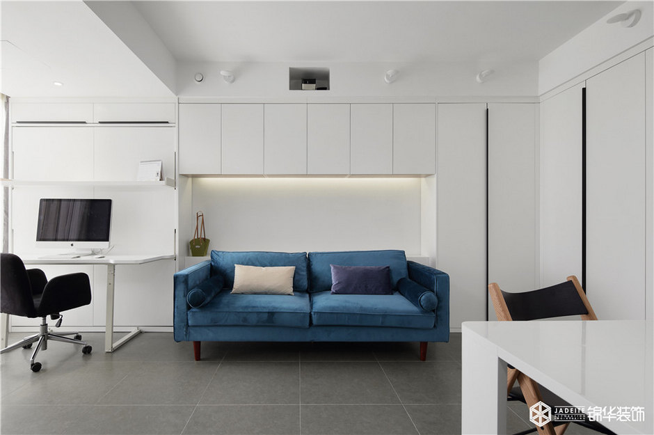 ▲客廳與陽臺(tái)打通,兼具書房與客廳功能,頂面吊柜增加整體收納!