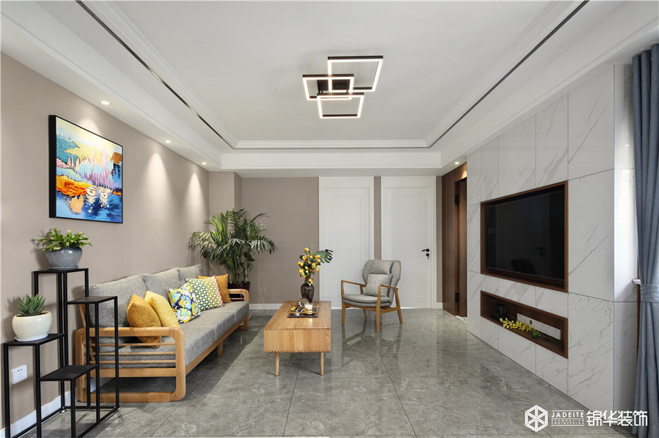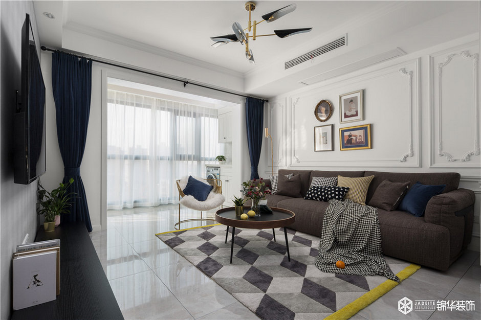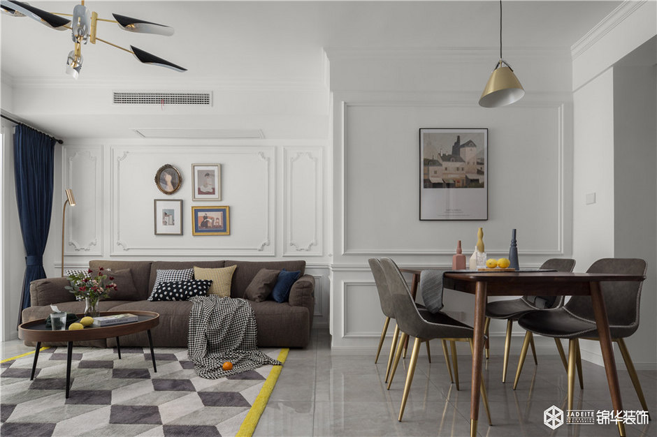 將陽臺(tái)空間納入室內(nèi),但因?yàn)樵柵_(tái)的梁無法拆除,如果將其全部遮蓋,客廳的整體高度會(huì)降低,設(shè)計(jì)師機(jī)智地做了一個(gè)美式經(jīng)典的格子頂,美觀實(shí)用,然后加已線條做出層次使客廳空間看起來高挑。
