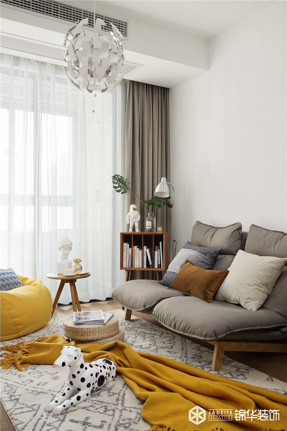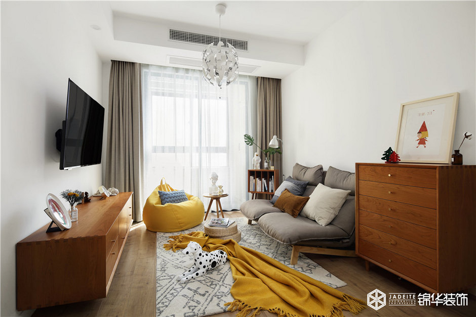 ▲色調(diào)以黃色、灰色、木色為主,溫暖又活潑。布藝、亞麻、木質(zhì)等天然材料的運(yùn)用,又為空間平添了一種慵懶的繾綣!