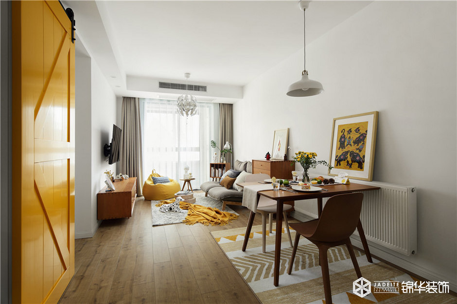 ▲明黃色谷倉門,是空間的視覺亮點(diǎn)之一,它作為廚房和客餐廳的分界線,既有效地節(jié)省了空間占比,又十分具有趣味性!