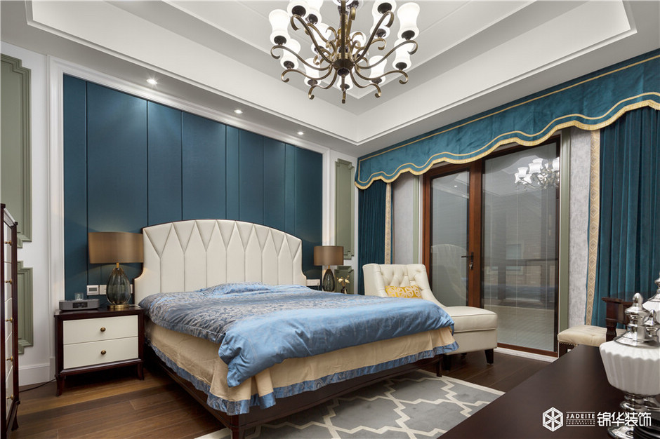 臥室延續(xù)藍色系,既呼應了客餐廳空間的色調(diào),又營造了沉穩(wěn)靜謐的休息氛圍。對于被忙碌生活以及工作包圍的業(yè)主來說,這樣的空間可以緩解白日的疲憊,讓身心得到有效的放松!